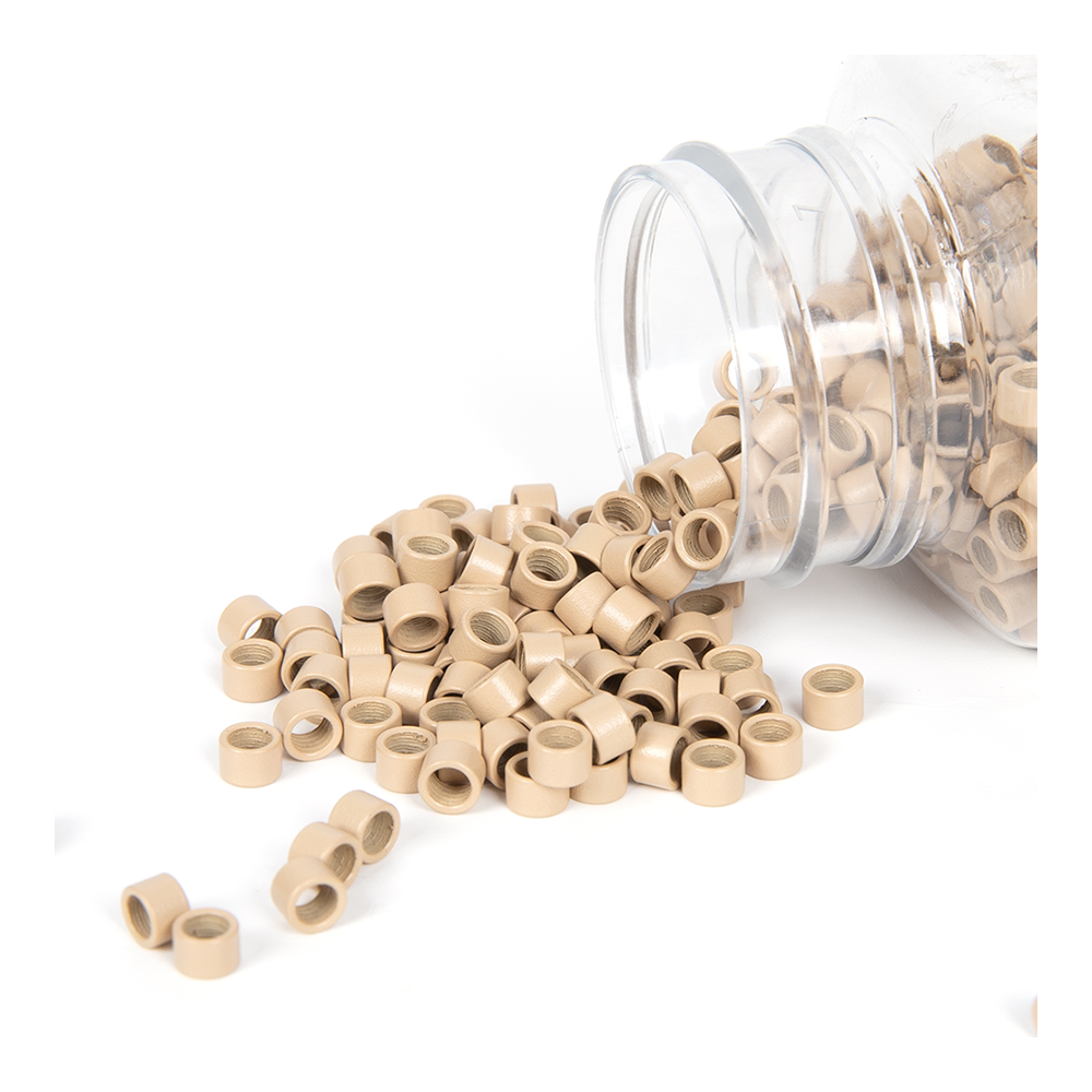 Envase de 1000 unidades de micro rings en tono rubio medio. Perfectos para profesionales que realizan gran volumen de aplicaciones, asegurando una fijación invisible y duradera de extensiones en cabellos claros.