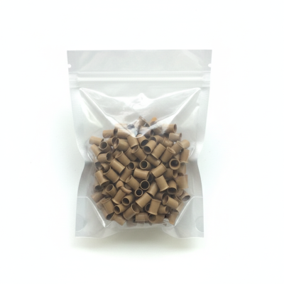 Blister de 50 unidades de micro rings de cobre, ideales para fijación de extensiones. Ofrecen durabilidad y una integración discreta en cabellos con tonos cálidos.