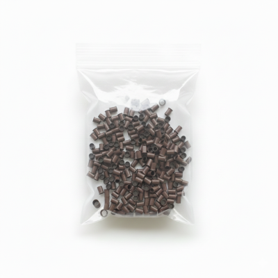 Blister de 50 unidades de micro rings de cobre, ideales para fijación de extensiones. Ofrecen durabilidad y una integración discreta en cabellos con tonos cálidos.